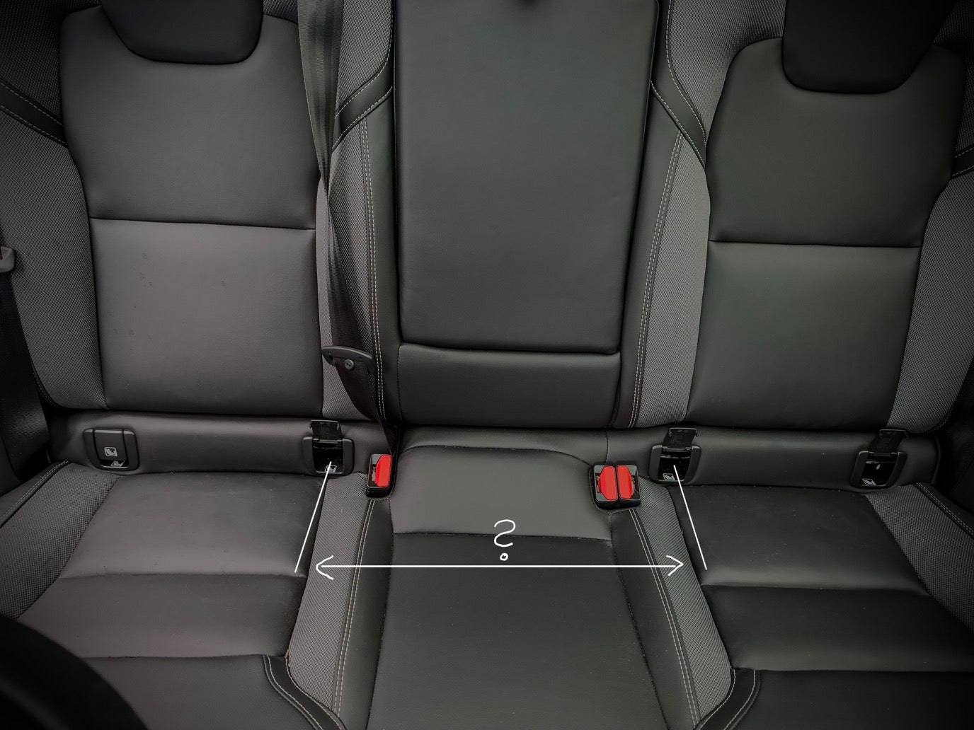 Als je twee DOXAFER® tegelijk in je auto wilt installeren, hebben we alleen de volgende maat van je nodig om mogelijke maatcombinaties aan te bevelen. Meet eenvoudig de afstand tussen de rechter Isofix-haak van de linker stoel en de linker Isofix-haak van de rechter stoel met een meetlat of meetlint. Altijd van het midden van de haak naar het midden van de haak.